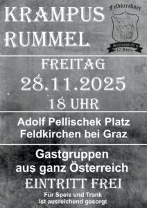 Sa, 22.11.2025 Hl. Kreuz am Waasen (250 Perchten), Raaba, Semriach, Köflach (50 Gruppen), Gratkorn (28 Gruppen), Gleisdorf (10 Gruppen), Fürstenfeld, Brandlucken – Anger (250+ Krampusse), Kraubath, Pöllau, Schladming (Eintritt – 800 Krampusse), Mariazell, Lannach (Almrausch – 200+ Krampusse), Kinderberg (Cést la vie)