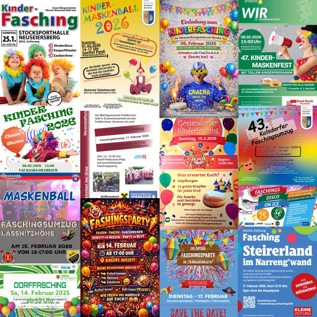 2026 starten die ersten Faschingsveranstaltung in Graz-Umgebung schon im Jänner, im Februar wartet dann wieder eine Vielzahl von Events in der Region. In der Übersicht dürfen natürlich der große Faschingsumzug in Graz und die Party im Bermuda Dreieck nicht fehlen.
