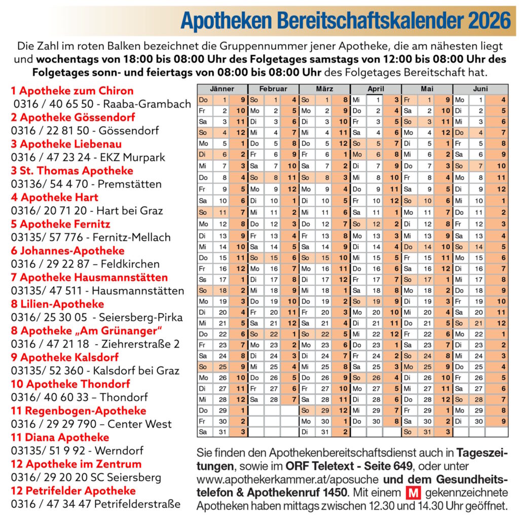 Bereitschaftsdienst Kalender Apotheken Graz und Graz-Umgebung 2025