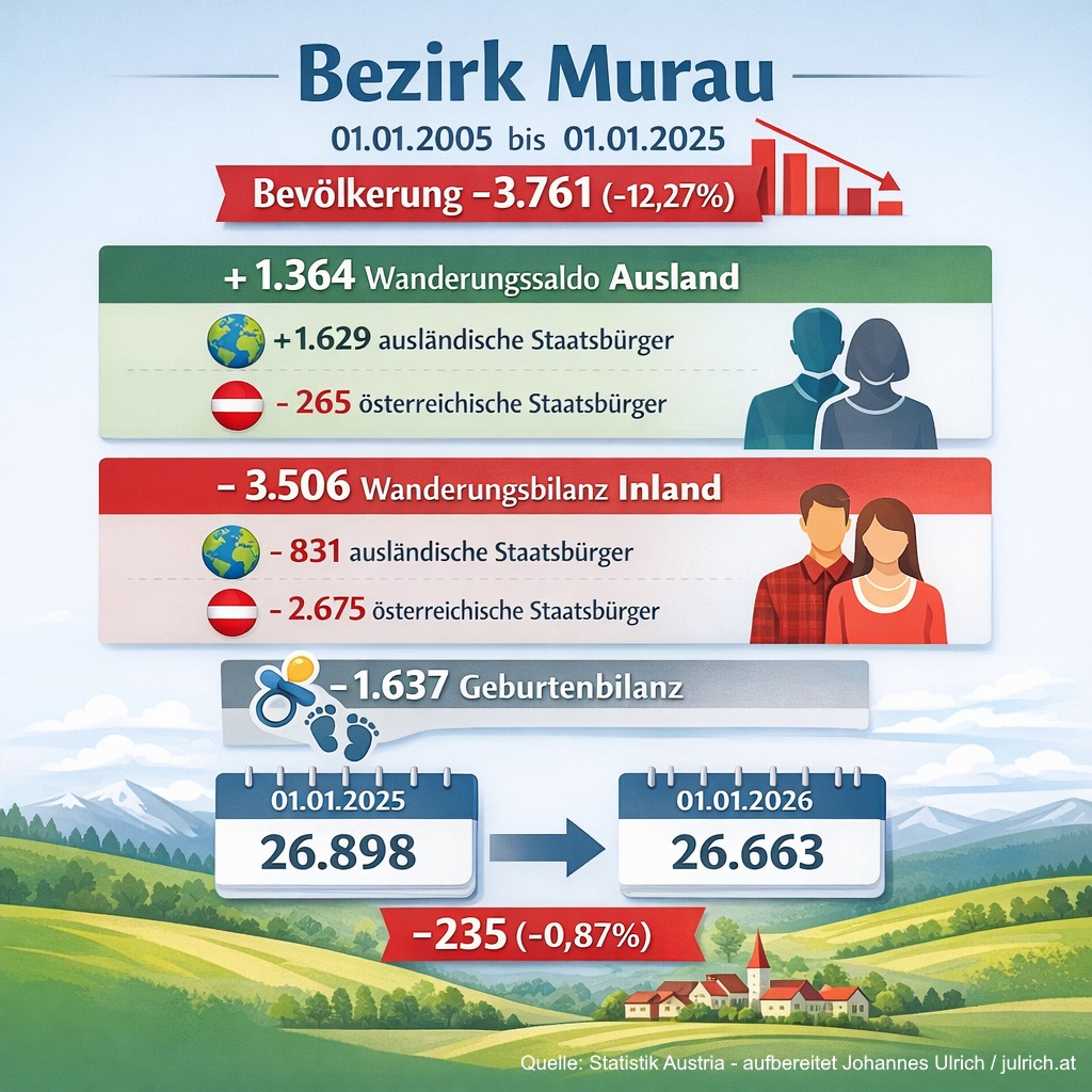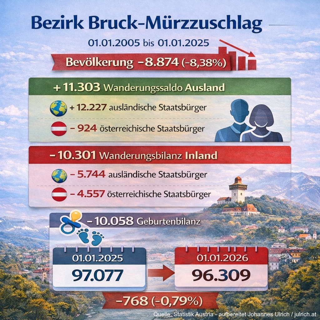 Am 9. Februar 2026 hat die Statistik Austria die neuen Bevölkerungszahlen für den 01.01.2026 veröffentlicht. Dass Bruck-Mürzzuschlag – was die absoluten Zahlen betrifft – der am stärksten schrumpfende Bezirk Österreichs ist, war dabei ein mediales Thema.