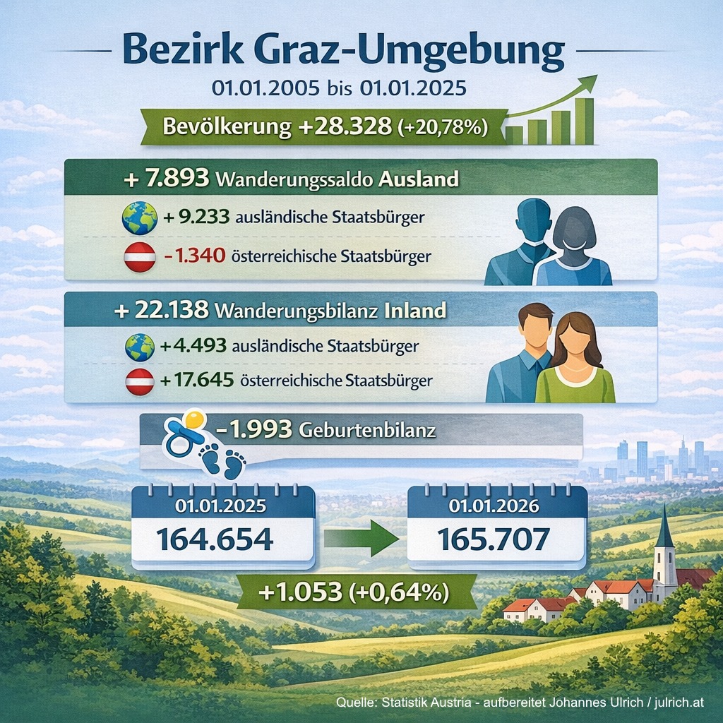 In Graz-Umgebung ist der Bevölkerungszuwachs ähnlich hoch. Hauptgrund ist dort jedoch die Zuwanderung aus anderen österreichischen Gemeinden, primär aus der Landeshauptstadt Graz. Und dann schon auch gefolgt durch Zuwanderung aus dem Ausland – wie in allen anderen Bezirken gibt es dabei aber große Unterschiede von einer Gemeinde zu anderen.