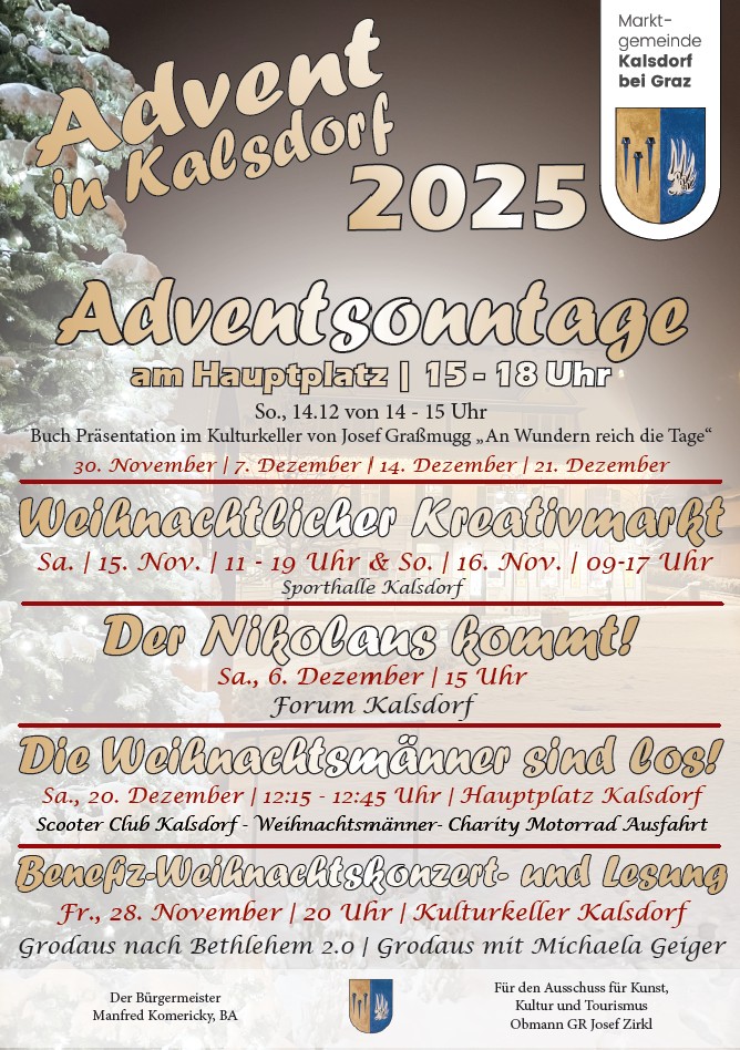 Die Marktgemeinde Kalsdorf lädt zum ersten Adventsonntag am Hauptplatz von 15 bis 18 Uhr