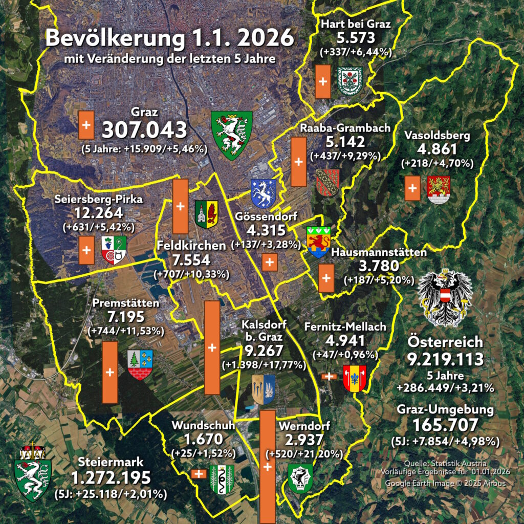 Am Montag hat die Statistik Austria den vorläufigen Bevölkerungsstand zum 01.01.2026 bekanntgegeben.