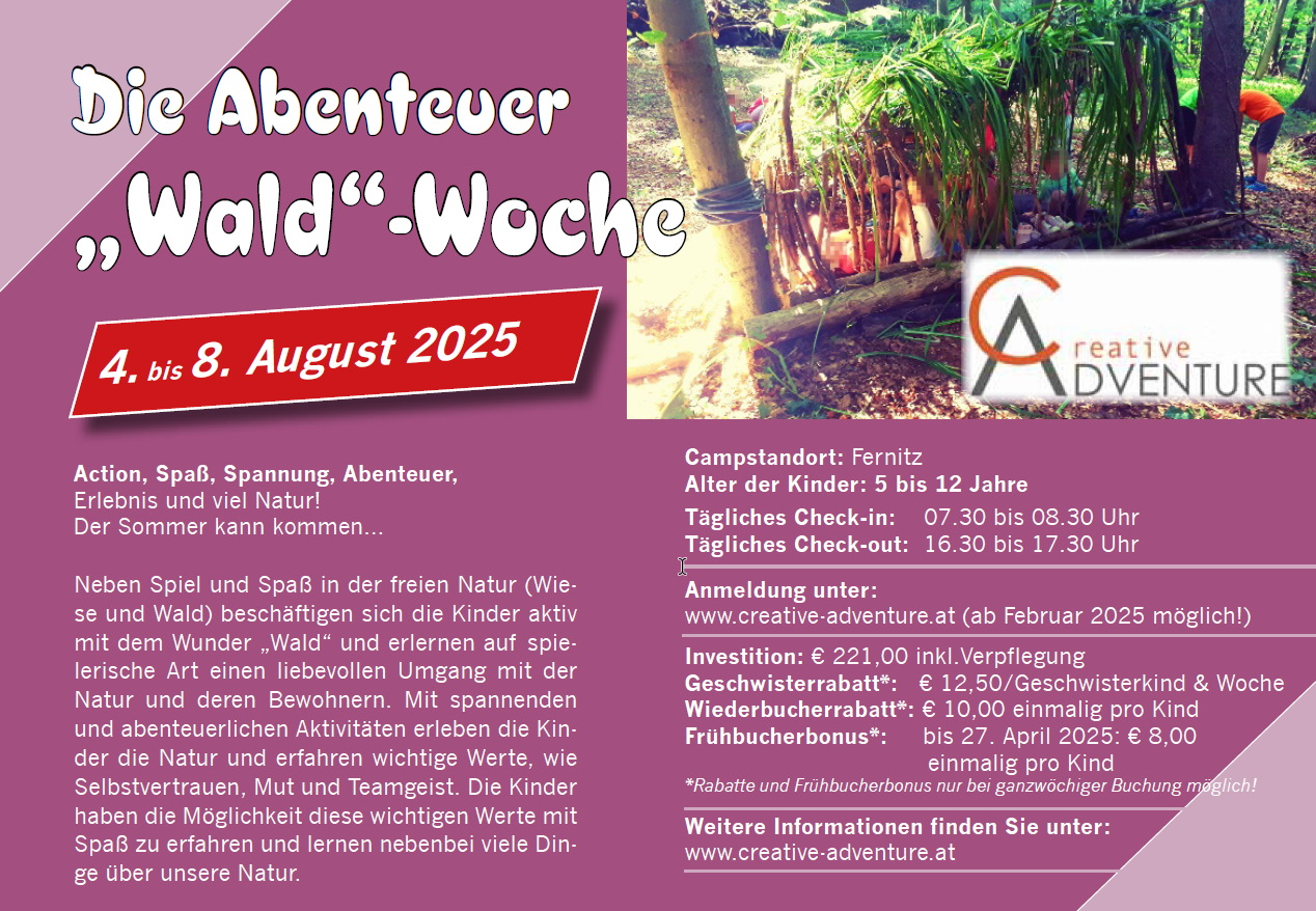 - Abenteuer „Wald“-„Woche in Fernitz 4. bis 8. August 2025