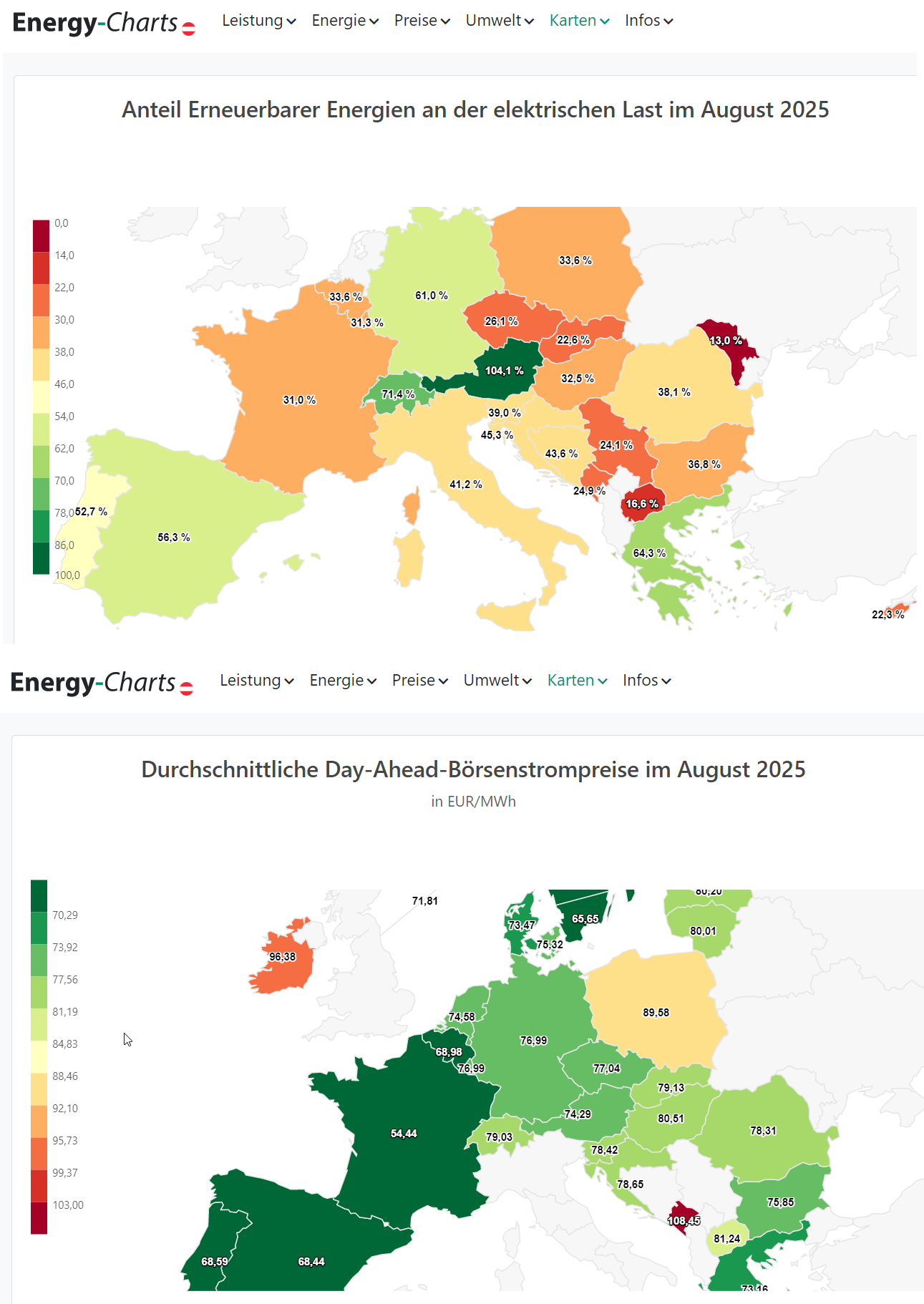 Österreich hatte im Juli und August 2025 einen relativ hohen Anteil Energieerzeugung aus Erneuerbaren, für den Großhandelspreis Strom hat das aber kaum Relevanz, da sich dieser in Zentraleuropa aufgrund der Transportkapazitäten mit den Nachbarländern ausgleicht.