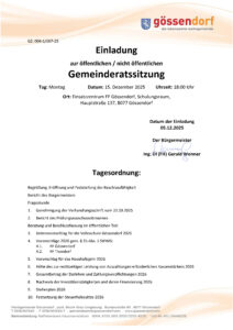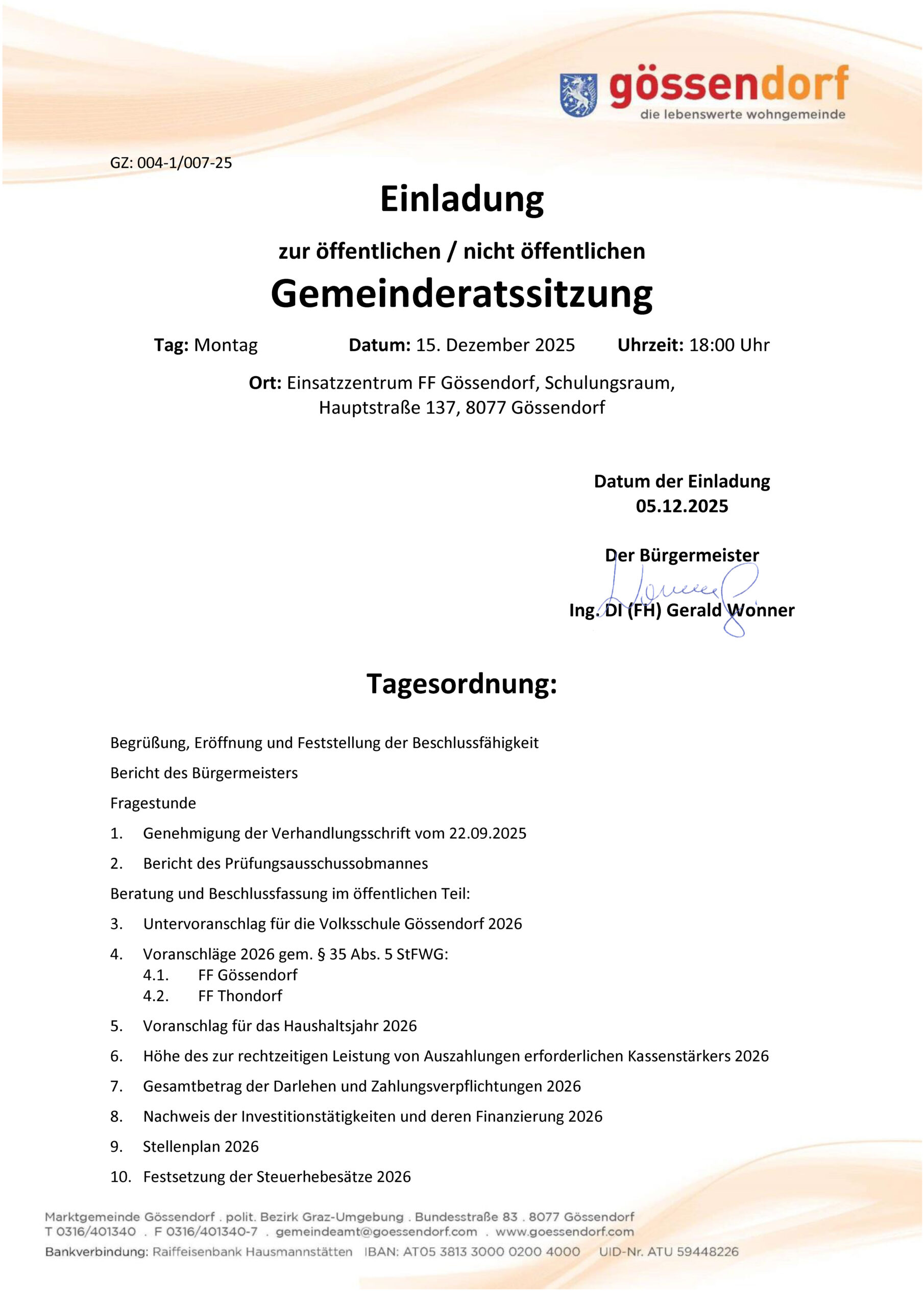 Am 15. Dezember 2025 stand in der Marktgemeinde Gössendorf die fünfte und letzte Gemeinderatssitzung im Jahr an und wie häufig in Gössendorf wurden alle Tagesordnungspunkte  EINSTIMMIG beschlossen.