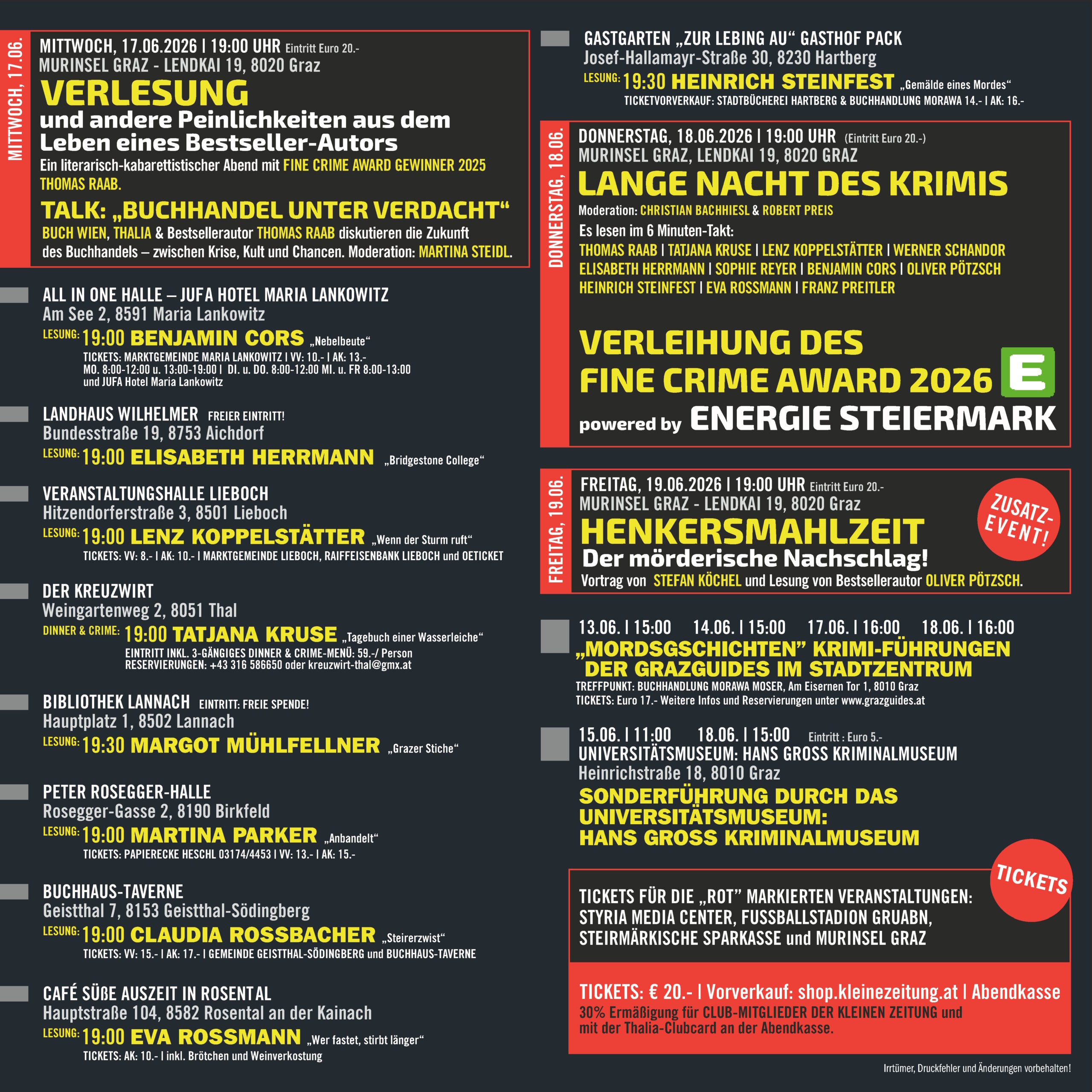 Von 13.–19. Juni 2026 wird Graz wieder zum Schauplatz für Spannung, True Crime und große Literatur.