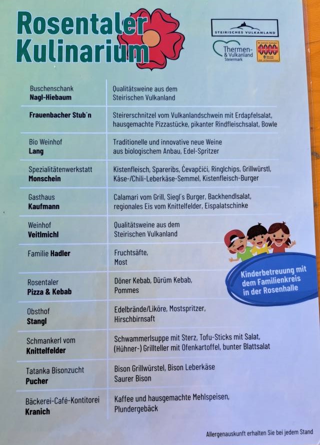 Das Rosentaler Kulinarium lädt auch 2025 wieder ein: An sechs Sommerabenden ab 18 Uhr (Juli bis Anfang August) erwarten dich über 30 Köstlichkeiten von 12 regionalen Betrieben, dazu viele steirische Weine, bunte Mehlspeisen und ein Kinderprogramm. Ganz ohne Live-Musik – denn hier steht der Genuss und das Gespräch im Mittelpunkt. Bei Regen wird auf Donnerstag verschoben.