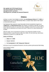 Auf alle, die vorbeischauen, warten € 10 Rabatt-Gutscheine (einlösbar ab € 30 auf eine Rechnung im Restaurant Edel). 💸