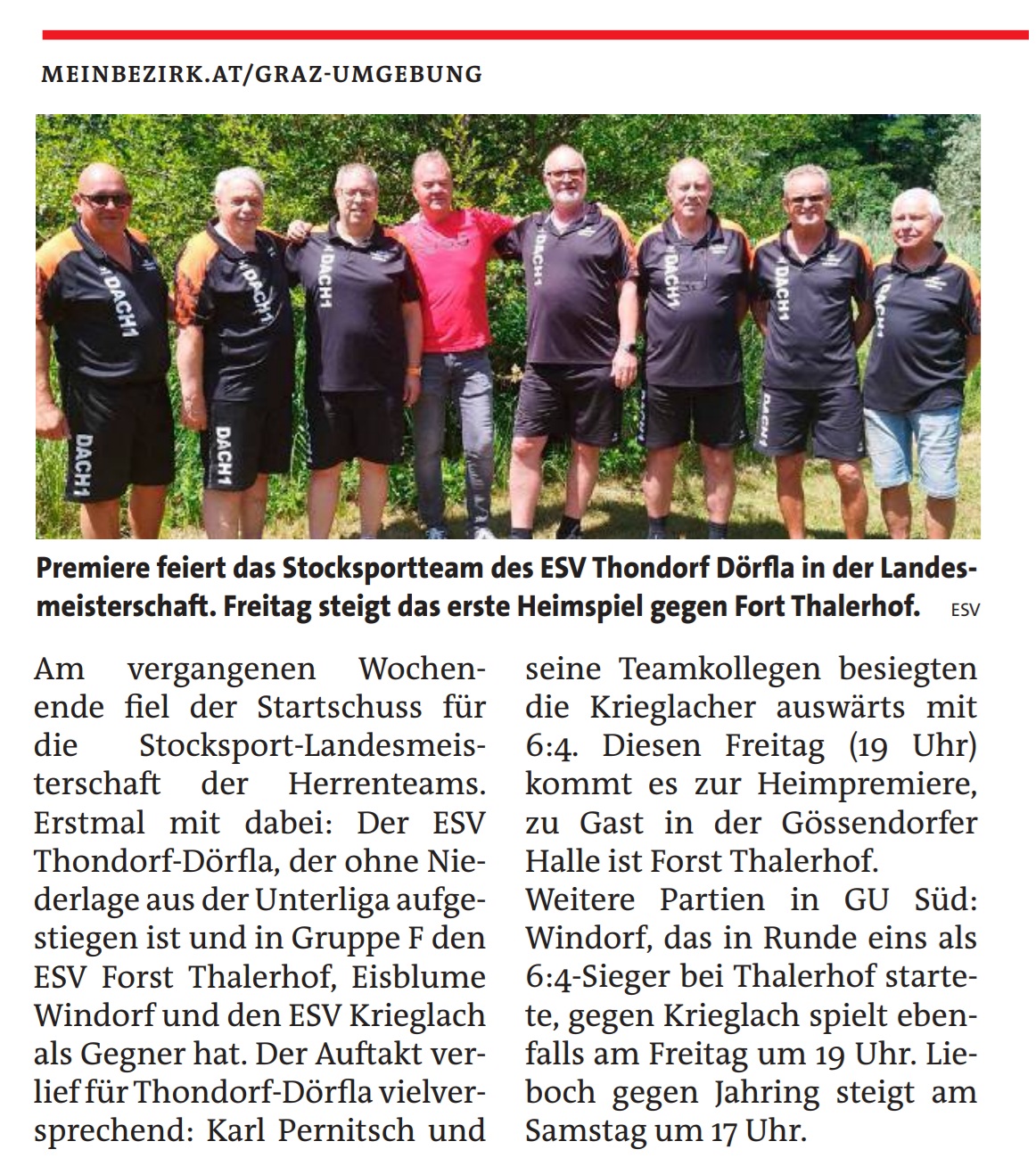 In der Gruppe F stehen in der Vorrunde sechs Partien gegen drei Gegner mit Hin- und Rückspiel auf dem Programm. Dabei kommt es am Freitag, dem 17. April, um 19 Uhr zum ersten Landesmeisterschaft-Heimspiel in der Geschichte des Vereins: Der ESV Thondorf-Dörfla empfängt den ESV Forst Thalerhof in Gössendorf.