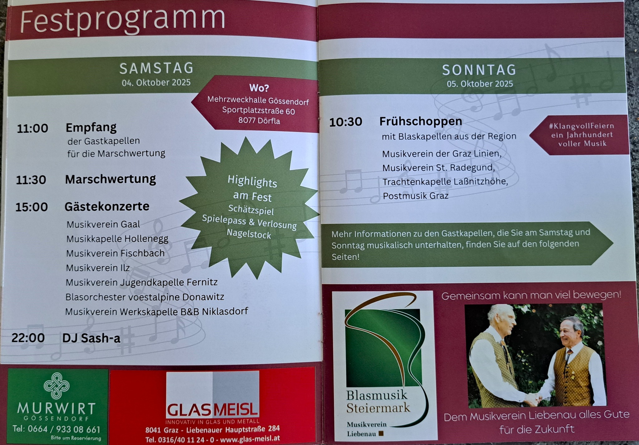 Das Jubiläumsfest des MV Liebenau findet am Areal der Mehrzweckhalle und des Sportplatzes Gössendorf statt. Die An- und Abfahrt zum Fest sollten ausschließlich über die Murauenstraße erfolgen. Auf der Sportplatzstraße besteht außerdem eine Tonnenbegrenzung. Für Busse (und Pkw) gibt es einen Parkplatz an der Murauenstraße. Pkw können außerdem auch den Parkplatz an der Sportplatzstraße verwenden.