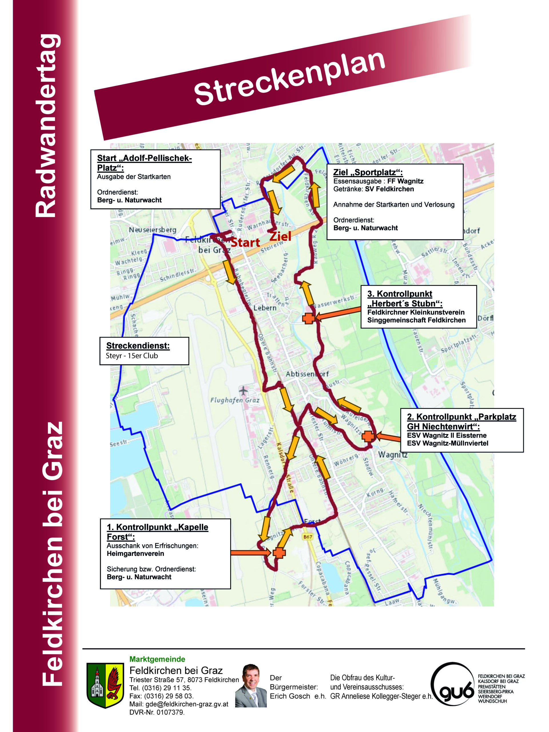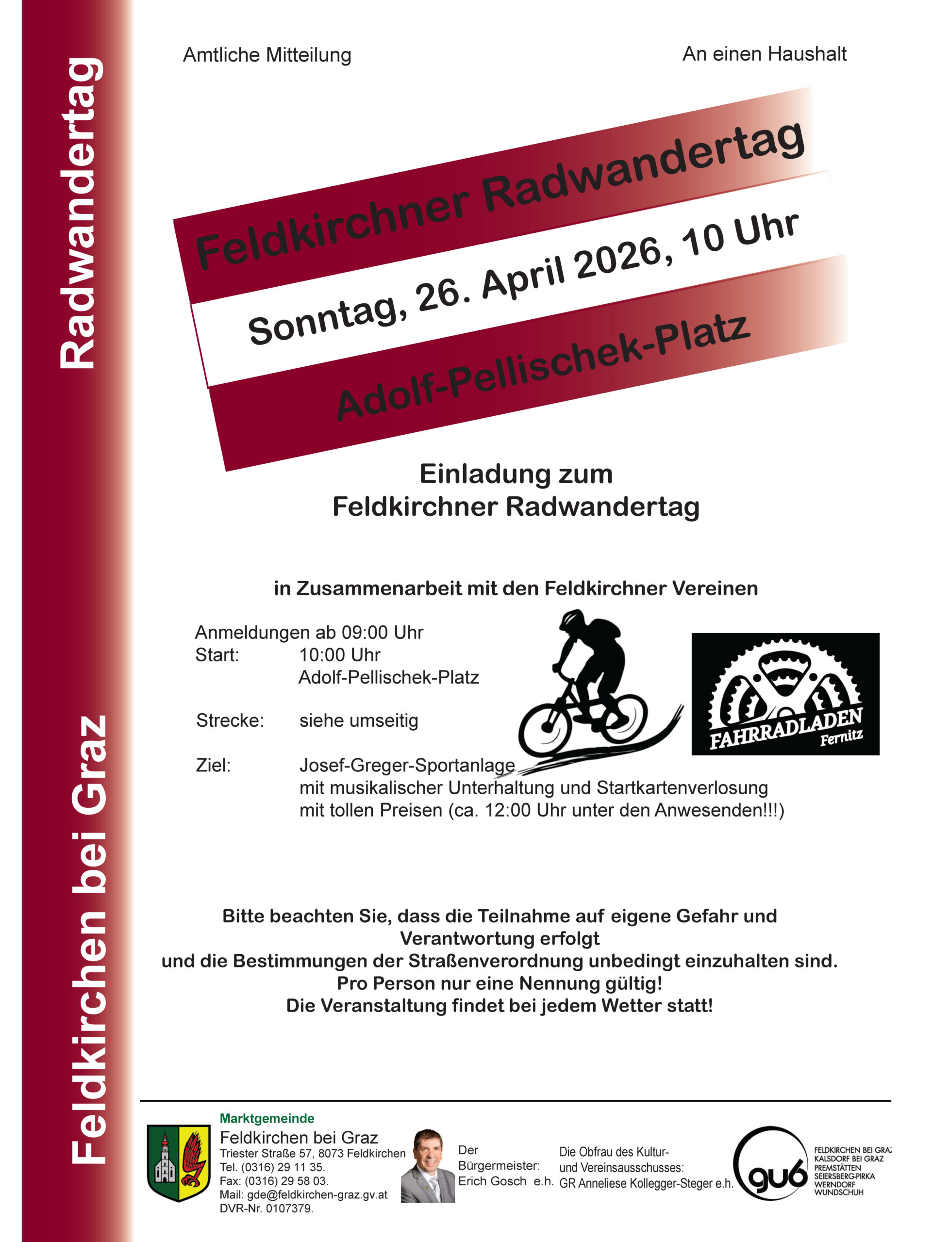Die Gemeinde und die Feldkirchner Vereine laden am 26. April zum Radwandertag. Gestartet wird um 10.00 Uhr beim Adolf-Pellischek-Platz, die Route führt über die Kapelle Forst, Niechtenwirt und Herbert’s Stubn zum Ziel in der Josef-Greger-Sportanlage, wo ab ca. 12.00 Uhr auf die Teilnehmer musikalische Unterhaltung, Startkartenverlosung und mehr warten. An den Kontrollpunkten sorgen Vereine für Streckendienst und Ausschank.
