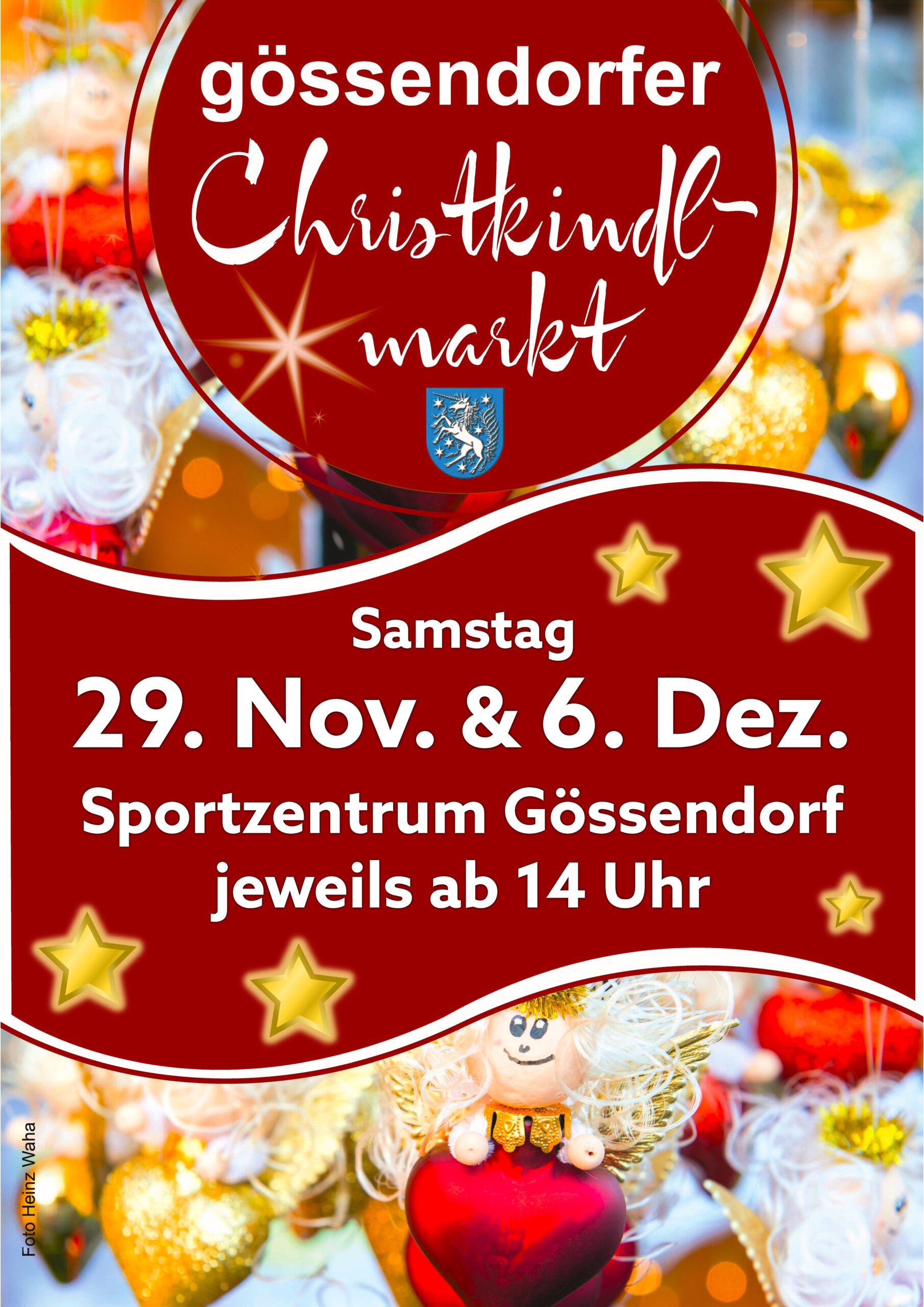 Die Marktgemeinde Gössendorf lädt Sie auch in diesem Jahr wieder herzlich zum Gössendorfer Christkindlmarkt am Samstag, 29. November 2025 und 6. Dezember 2025 jeweils ab 14:00 Uhr beim Sportzentrum Gössendorf ein.