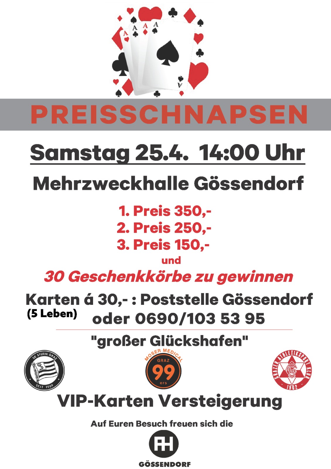 Am Samstag, den 25. April 2026, laden die AH Gössendorf um 14 Uhr wieder zum beliebten Preisschnapsen in die Mehrzweckhalle Gössendorf!