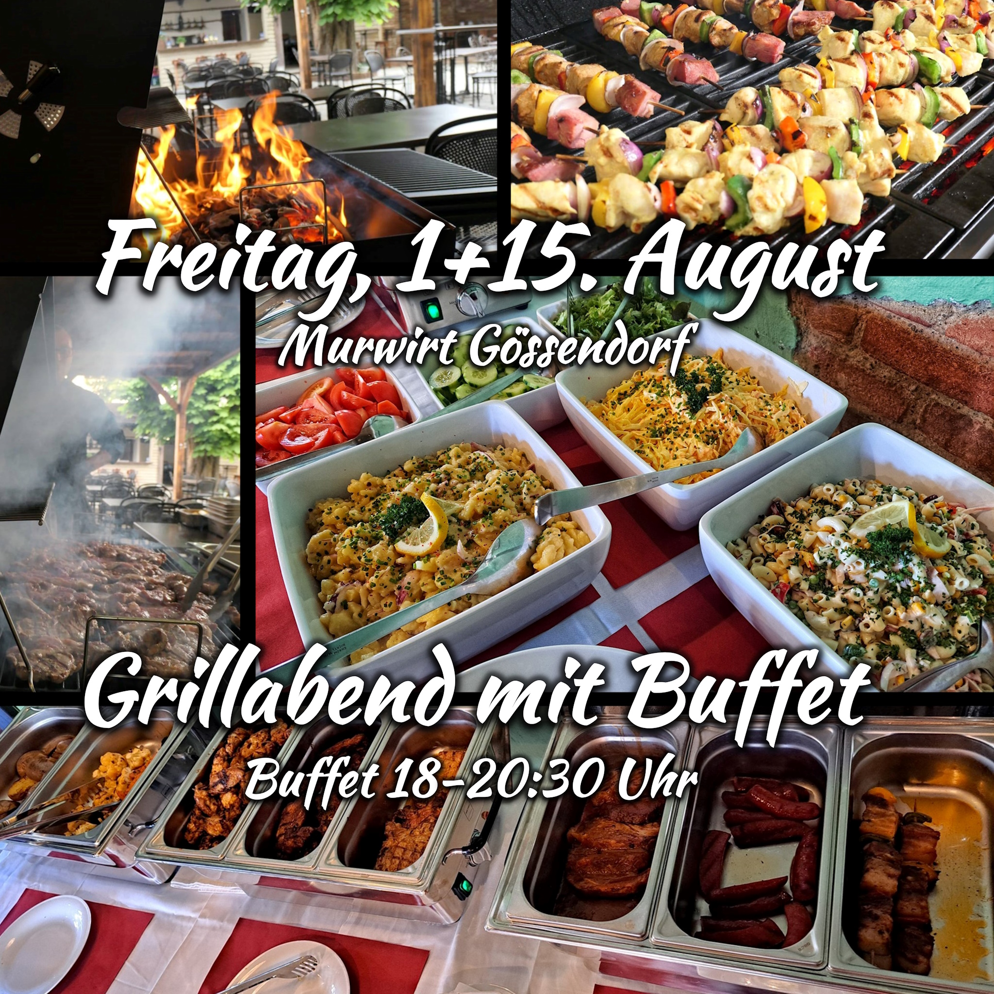 Buffet – All you can eat von 18 bis 20:30 UhrFleisch, Würstel, Salate, Gemüse & Beilagen
