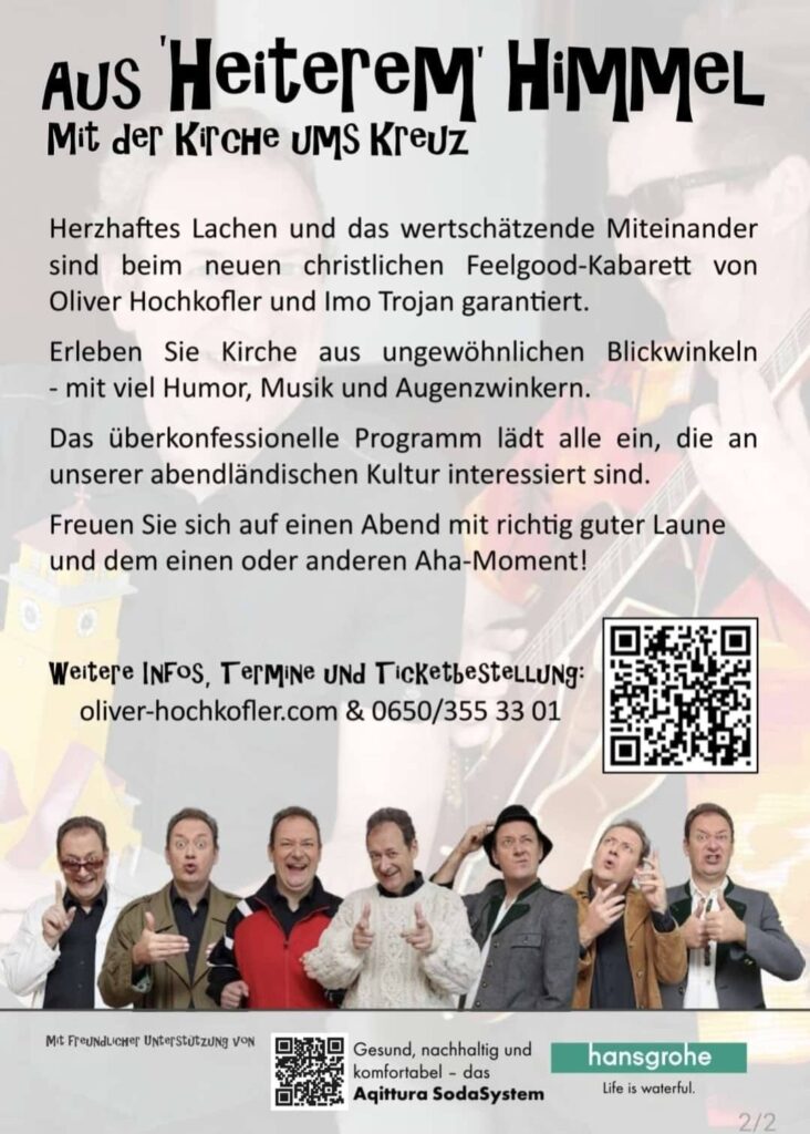 Unter dem Titel „Aus heiterem Himmel – Mit der Kirche ums Kreuz“ erwartet die Besucher ein humorvoller, pointierter Blick auf Kirche, Glauben und das ganz normale Leben dazwischen – zum Schmunzeln, Nachdenken und herzhaft Lachen.