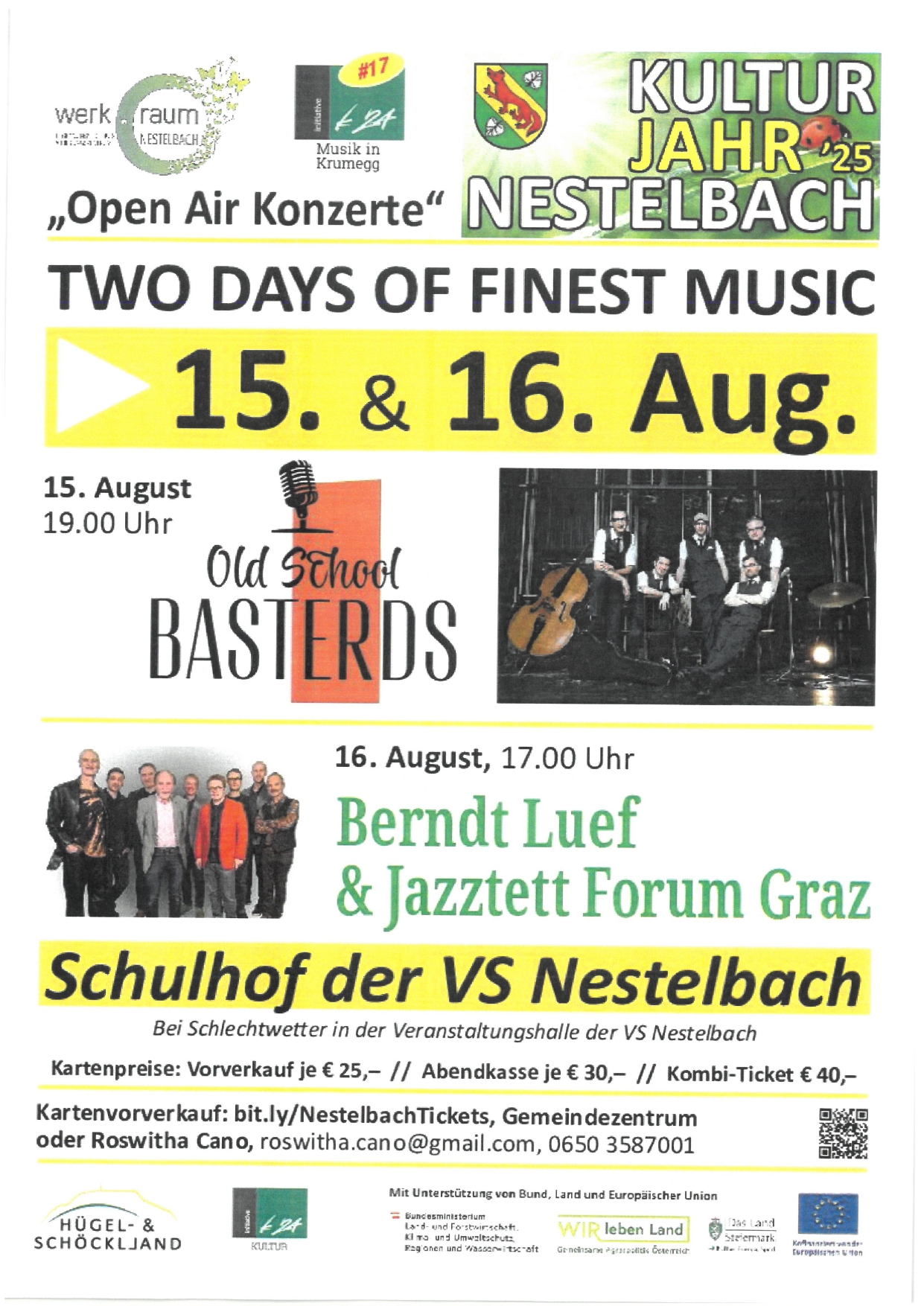 Musik unter freiem Himmel – das gibt’s am 15. und 16. August in Nestelbach bei Graz. Beim Event „Two Days of Finest Music“ verwandelt sich der Schulhof der Volksschule Nestelbach in eine stimmungsvolle Open-Air-Bühne. An zwei Tagen erwartet Musikfans ein abwechslungsreiches Konzertprogramm mit hochkarätigen Künstlern.