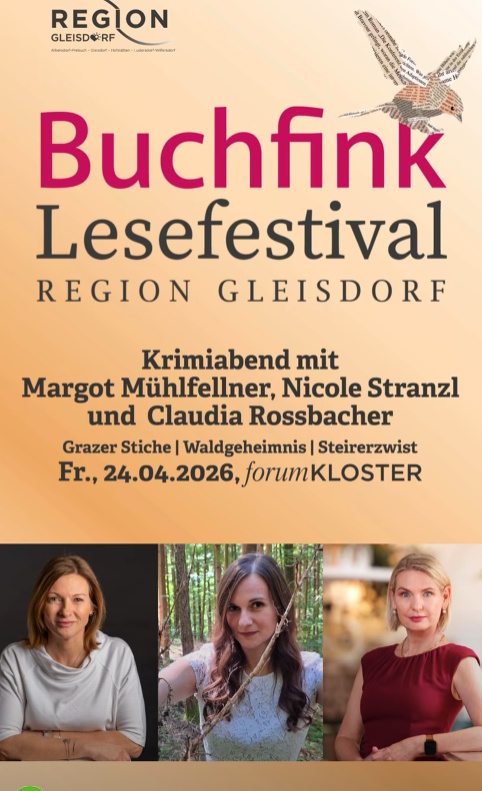 Ein Krimi-Triumvirat sorgt zum Festivalfinale für Gänsehaut-Feeling im forumKLOSTER Gleisdorf: Tatort Steiermark! Margot Mühlfellner liest aus „Grazer Stiche“, Nicole Stranzl aus „Waldgeheimnis“ und Claudia Rossbacher aus ihrem neuen Steirerkrimi „Steirerzwist“.