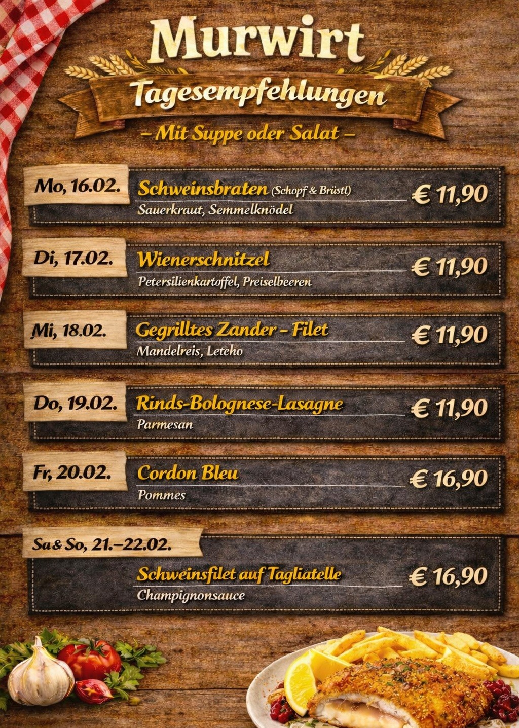 Tagesempfehlungen Murwirt Gössendorf – KW 08 & 09 inkl. Suppe oder Salat