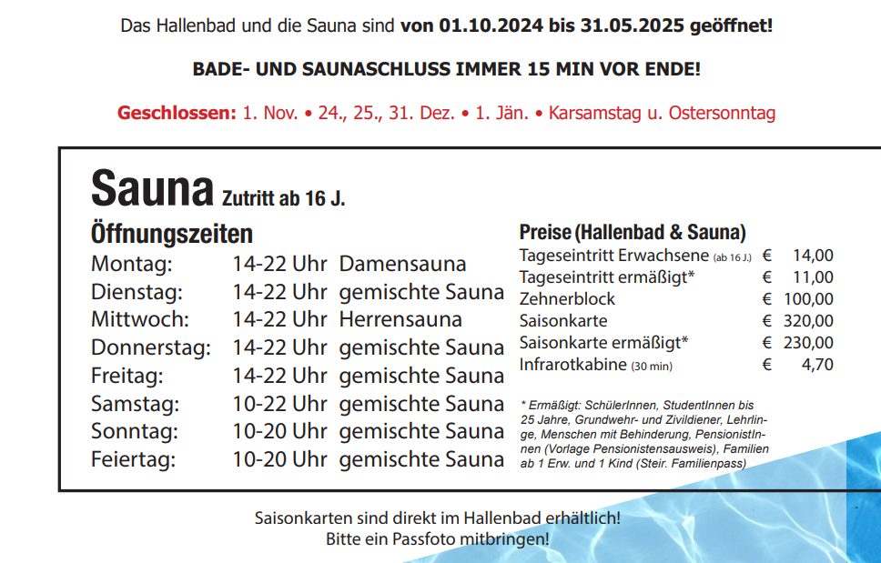 Ab 1. Oktober 2025 öffnet das Hallenbad wieder – die ersten Tage noch nach den alten Preisen, diese werden die nächten Tage beschlossen.