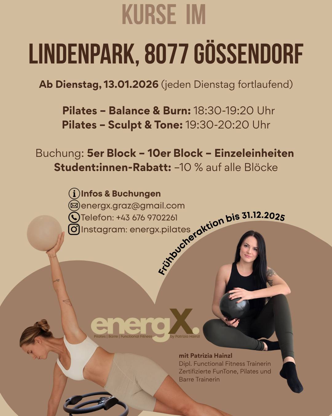 Pilates- und Functional-Fitness-Kurse in unmittelbarer Nähe! Ab Jänner 2026 finden meine wöchentlichen Klassen an zwei Standorten statt – im Lindenpark (Gössendorf) und im Boulderclub (Graz)....