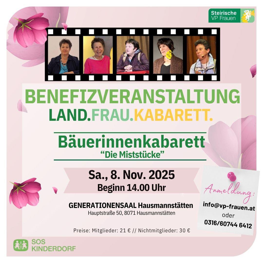 Bäuerinnenkabarett „die Miststücke“ Wann: 08.11.2025 Uhrzeit: 14 Uhr Wo: Generationensaal in Hausmannstätten bei Graz Die „Miststücke“ rücken das Bild über Landwirtschaft und Bäuerinnen zurecht, sie halten humorvoll einen...