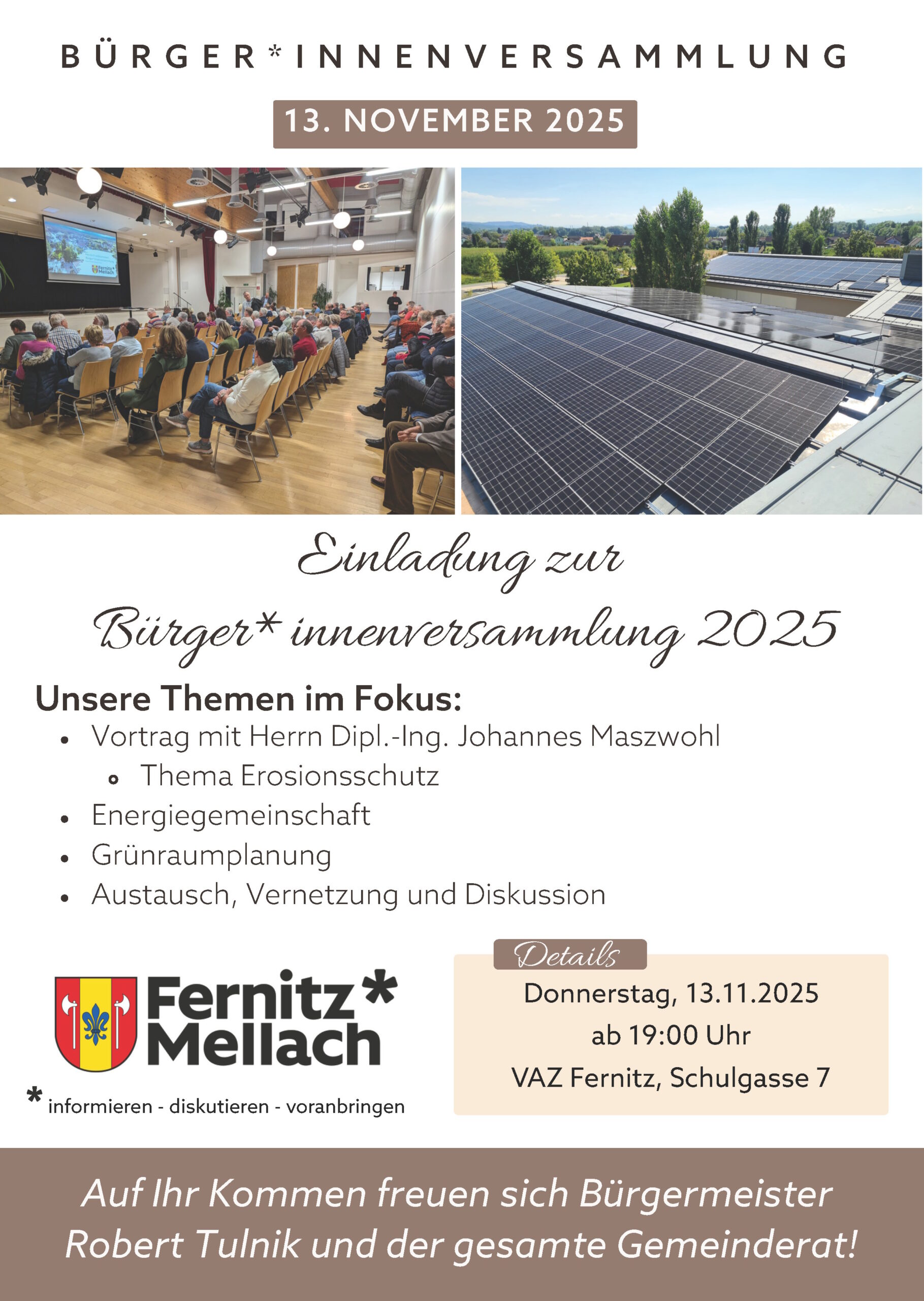 BÜRGER*INNENVERSAMMLUNG 2025 Einladung zur Bürger*innenversammlung Fernitz-Mellach Unsere Themen im Fokus: - Vortrag mit Herrn Dipl.-Ing. Johannes Maszwohl Thema Erosionsschutz - Energiegemeinschaft - Grünraumplanung - Austausch,...
