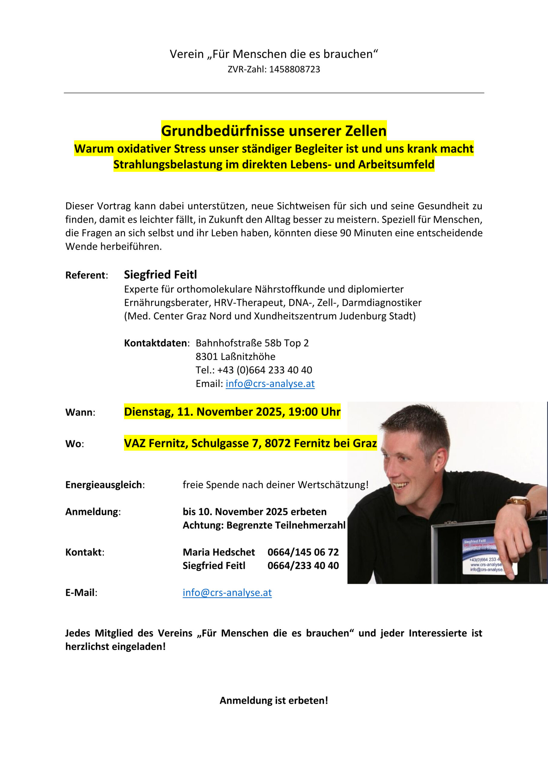VORTRAG: GRUNDBEDÜRFNISSE UNSERER ZELLEN Warum oxidativer Stress unser ständiger Begleiter ist und uns krank macht Strahlungsbelastung im direkten Lebens- und Arbeitsumfeld Verein "Für Menschen die...