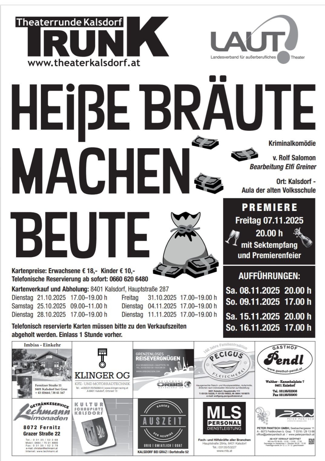 HEIßE BRÄUTE MACHEN BEUTE Kriminalkomödiev. Rolf SalomonBearbeitung Efi Greiner Ort: Kalsdorf – Aula der alten Volksschule PREMIERE Freitag 07.11.2025, 20.00 hmit Sektempfang und Premierenfeier AUFFÜHRUNGEN:...