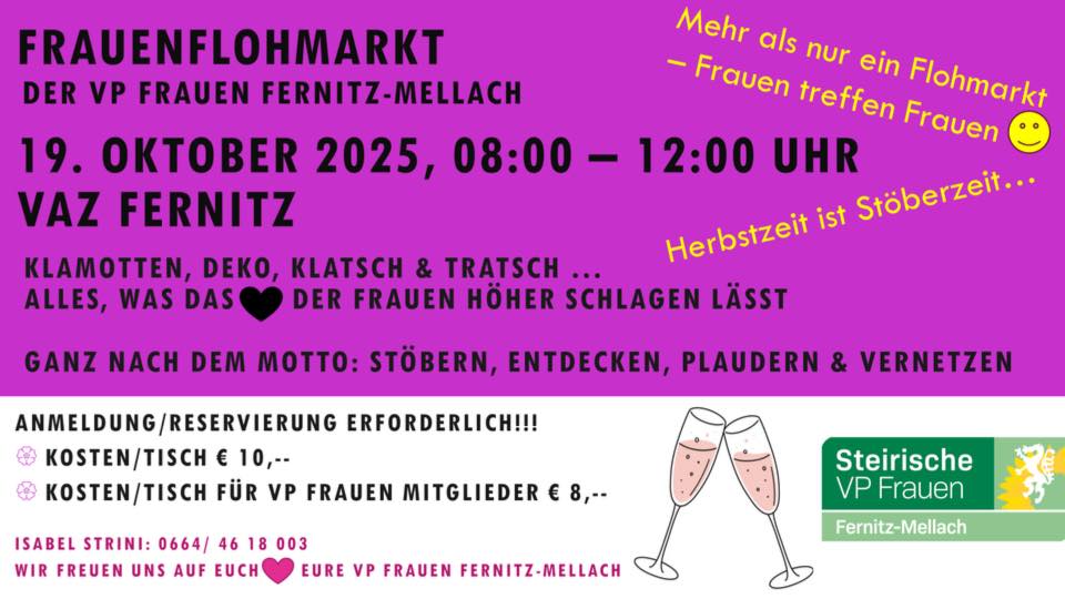 Veranstaltungszentrum Fernitz Schulgasse 7, Fernitz-Mellach, Österreich3. Frauenflohmarktam Sonntag, den 19. Oktober 2025 im VAZ Fernitz! Herbstzeit ist Stöberzeit… mehr als nur ein Flohmarkt - Frauen treffen Frauen! Ganz unter dem...