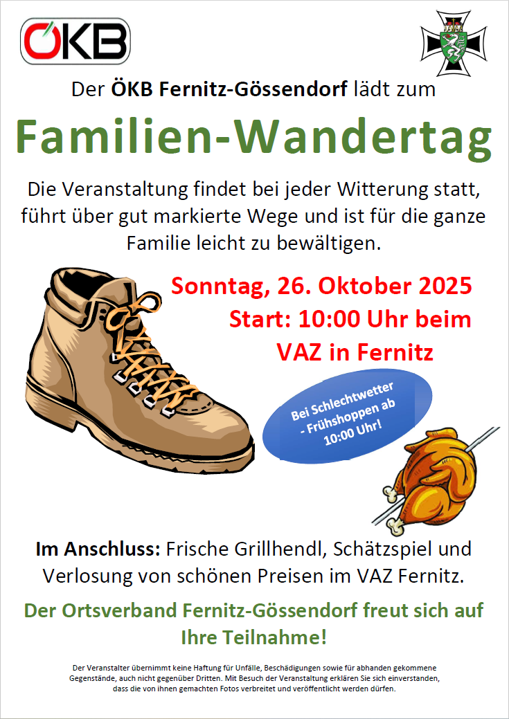 Veranstaltungszentrum Fernitz Schulgasse 7, Fernitz-Mellach, ÖsterreichDer ÖKB Fernitz-Gössendorf lädt zum Familien-Wandertag Die Veranstaltung findet bei jeder Witterung statt, führt über gut markierte Wege und ist für die ganze Familie leicht...