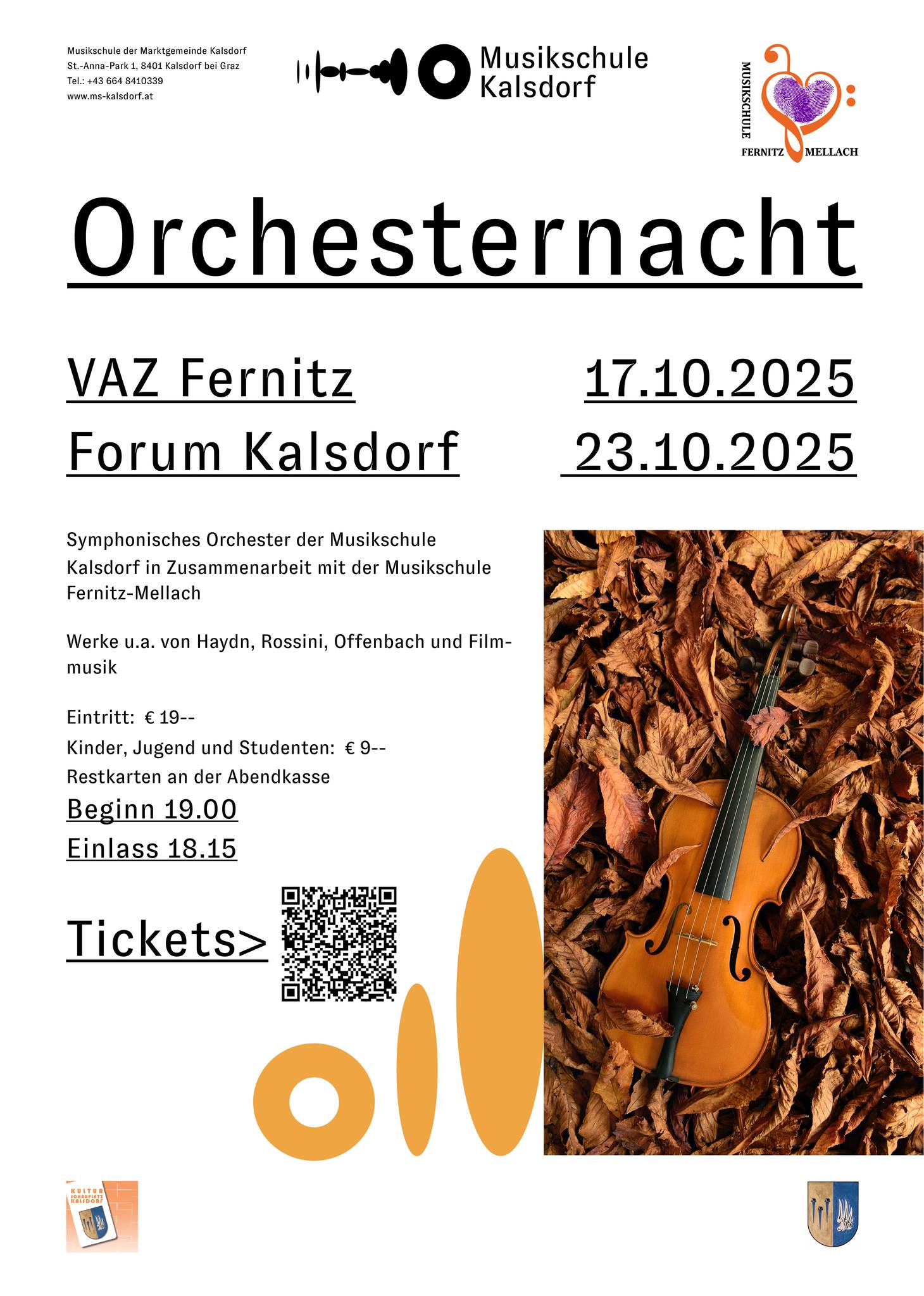 Veranstaltungszentrum Fernitz Schulgasse 7, Fernitz-Mellach, ÖsterreichSymphonisches Orchester der Musikschulen Kalsdorf und Fernitz-Mellach. Werke u.a. von Haydn, Rossini, Offenbach und Filmmusik Eintritt: € 19,--Kinder, Jugend und Studenten: € 9,--Restkarten an der...