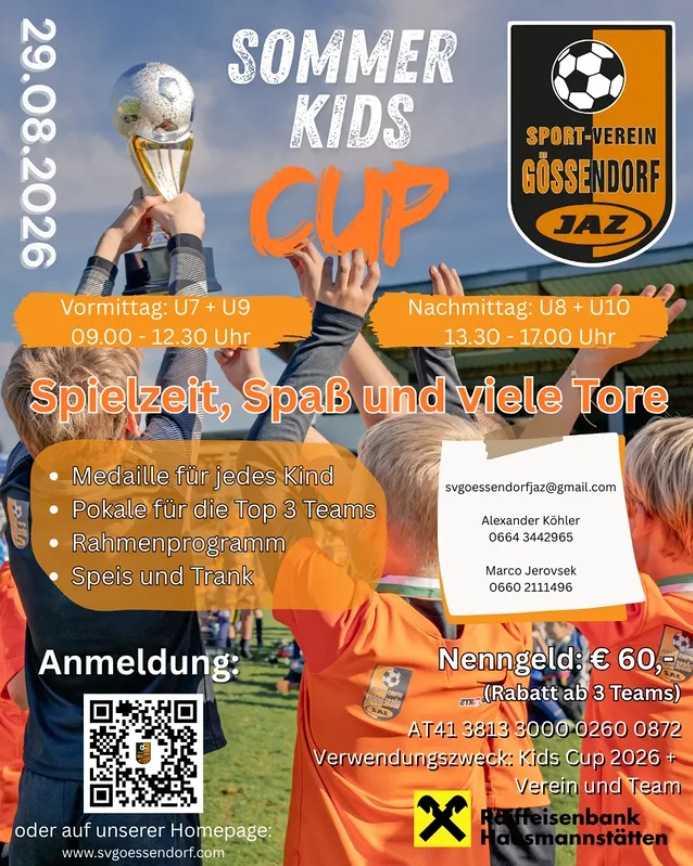 Sommer Kids Cup 2026 Das JAZ Gössendorf veranstaltet am 29.8.2026 ein Vorbereitungsturnier - den Sommer Kids Cup. Wir möchten eure Nachwuchsmannschaften dazu recht herzlich einladen....