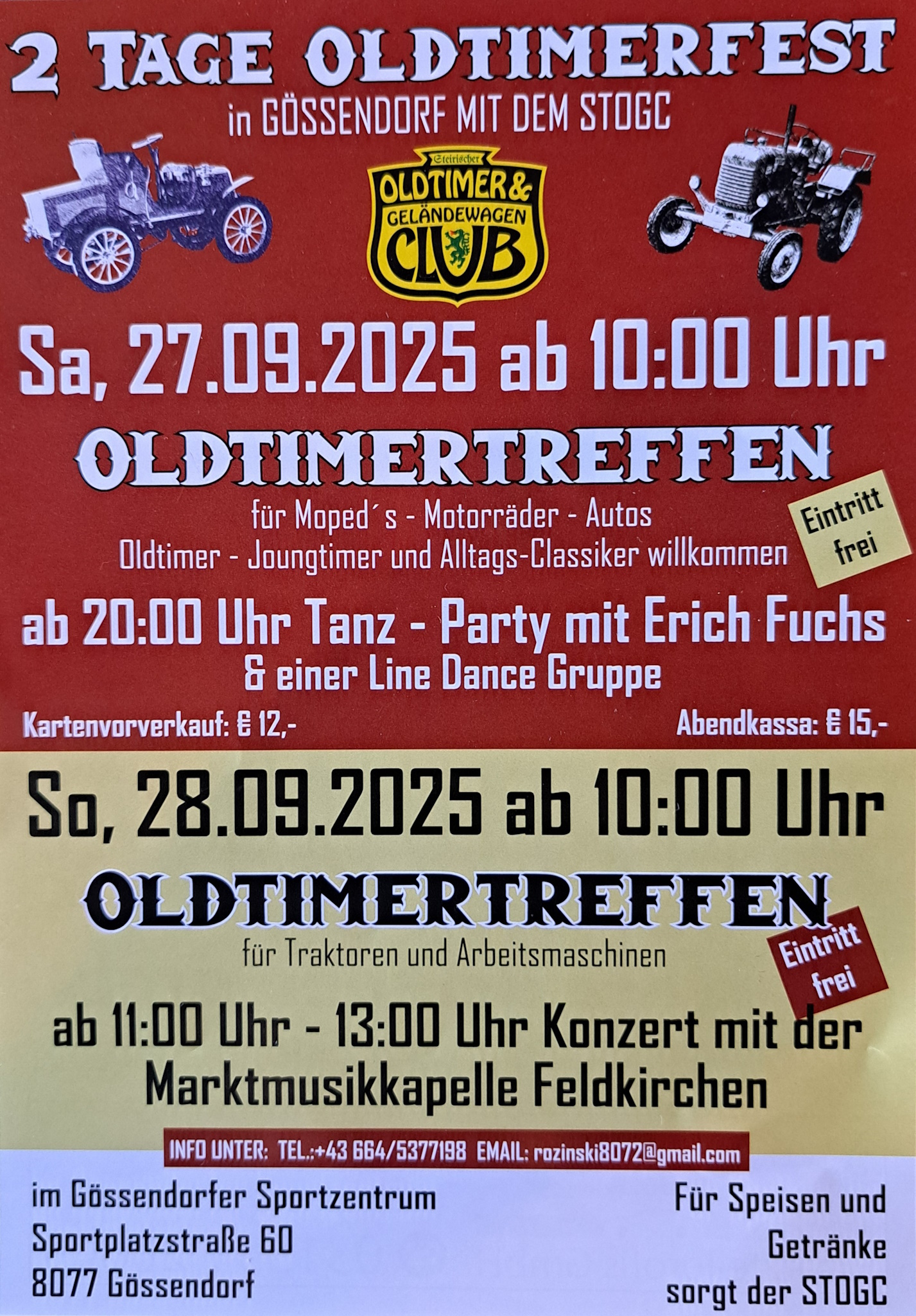 2 TAGE OLDTIMERFESTin Gössendorf mit dem STOGCC Steirischer Oldtimer & Geländewagen Club Dieser feierst sein 45-Jahr-Jubiläum! Sa, 27.09.2025 ab 10:00 UhrOLDTIMERTREFFENfür Moped’s – Motorräder –...