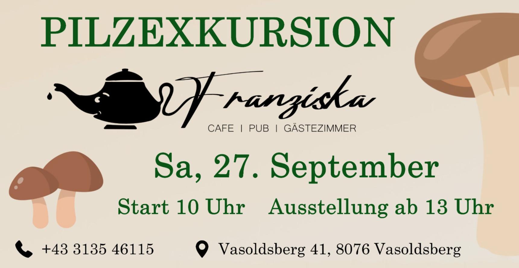 Herzliche Einladung zur Pilzexkursion Vasoldsberg 2025! Treffpunkt: Samstag 27.9.2025, 10 Uhr, beim Café Franziska in Vasoldsberg Viele Pilzexperten und Pilzexpertinnen des Arbeitskreises Heimischer Pilze Joanneum...