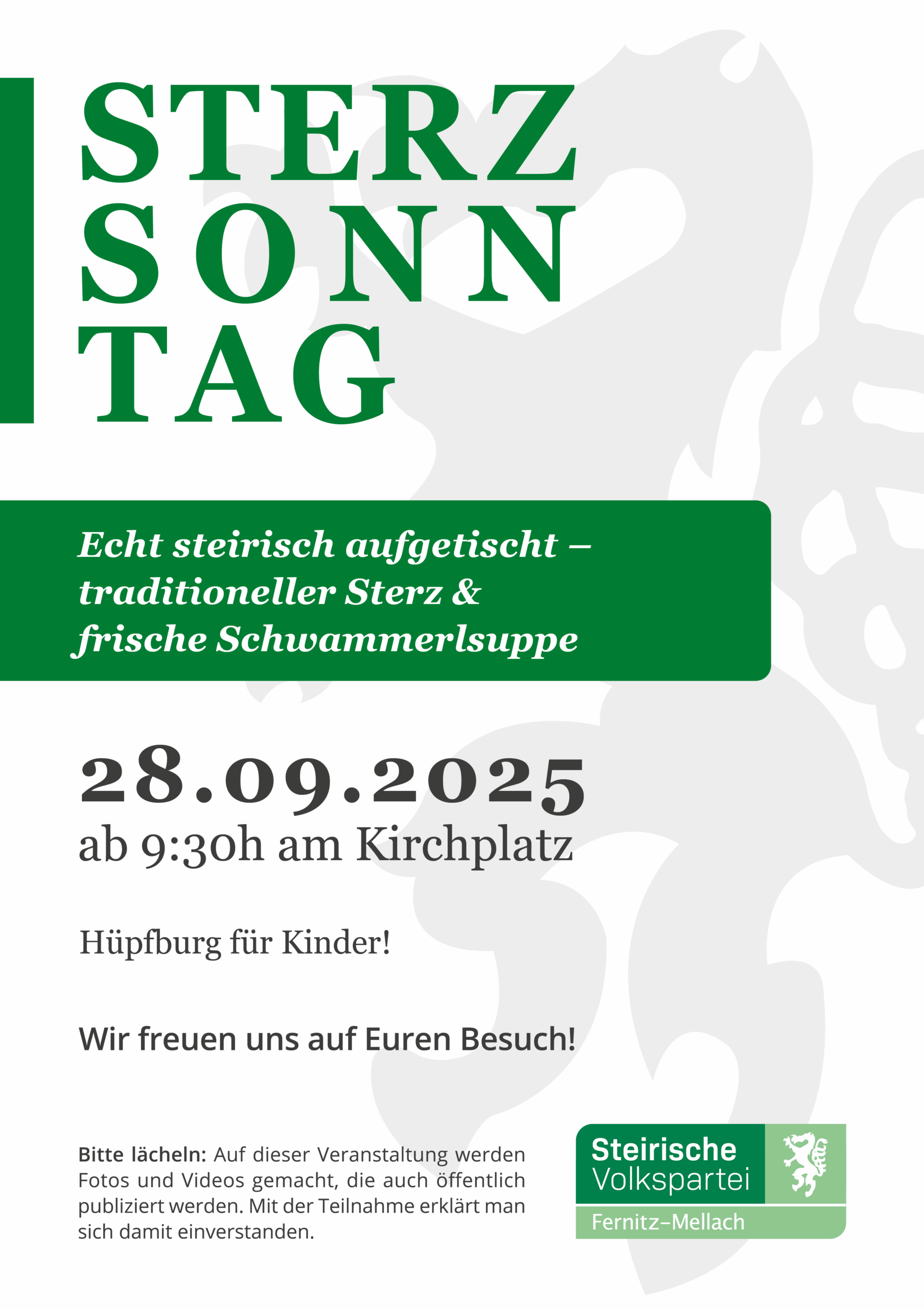 Echt steirisch aufgetischt - traditioneller Sterz & frische Schwammerlsuppe - Hüpfburg für Kinder Wir freuen uns auf Euren Besuch! Steirische Volkspartei Fernitz-Mellach ORT: Kirchplatz FERNITZ...