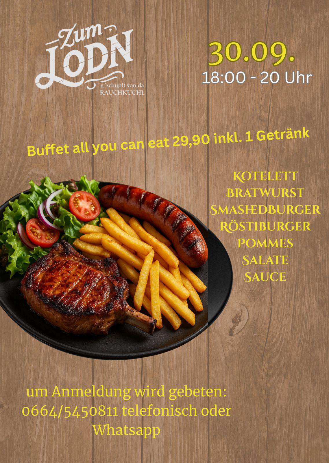 Das nächste Event wartet auf euch! Grillbuffet All You Can Eat 🫡🔥 30.09. von 18:00 - 20:00 Uhr im Zum Lodn - g'schupft von da...