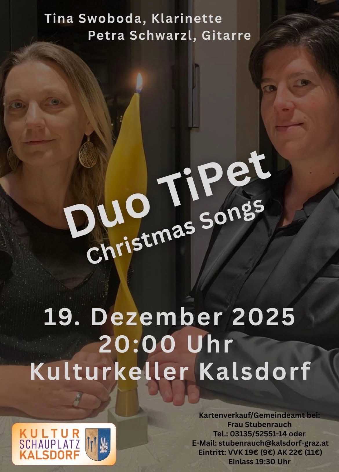Tina Swoboda und Petra Schwarzl unterrichten an der Musikschule Kalsdorf. Als Duo TiPet interpretieren sie am 19. Dezember um 20.00 Uhr im Kulturkeller Kalsdorf Christmas Songs mit Klarinette und Gitarre.... |