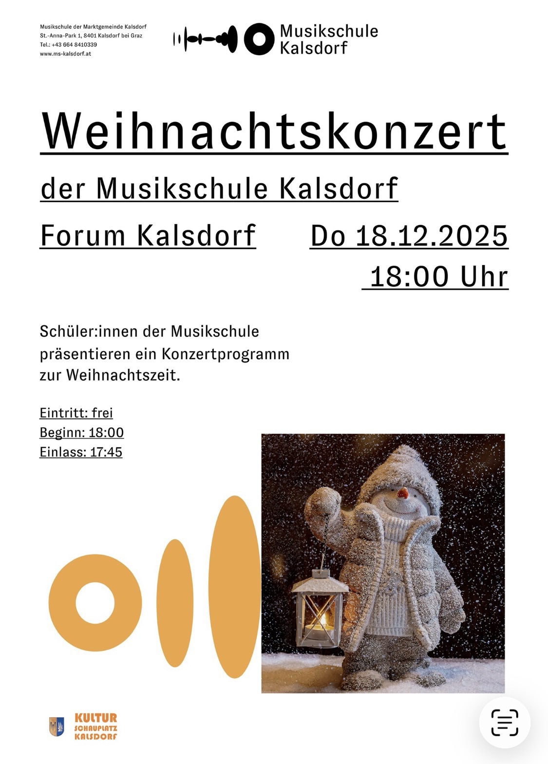 Weihnachtskonzert - Musikschule Fernitz-Mellach Die Schüler*innen und Lehrer*innen der Musikschule Ferntiz-Mellach gestalten einen popigen & jazzigen Abend. ORT: Musikschule Fernitz-Mellach DATUM UND UHRZEIT: 17.12.2025 - 18:30 Uhr