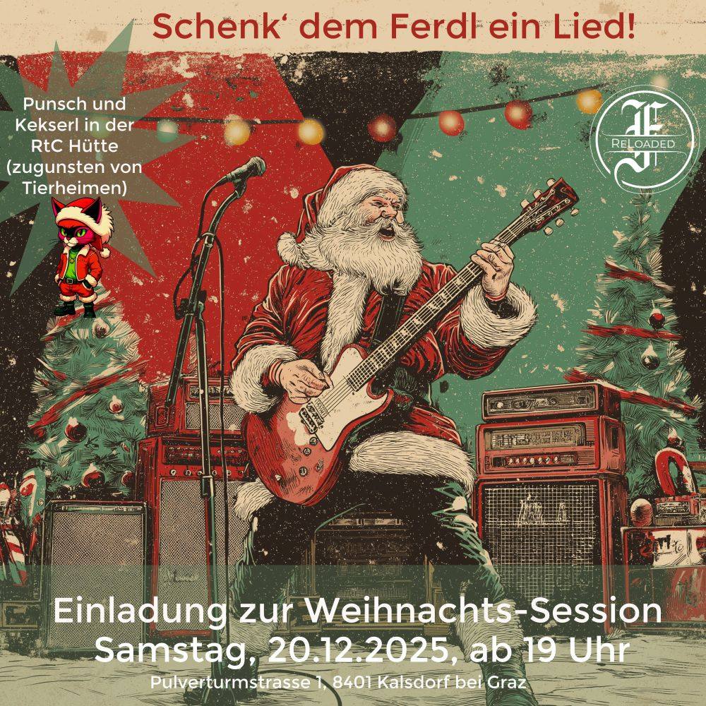 Weihnachtssession für alle Musiker und Musikliebhaber, freier Eintritt. Kommt vorbei und rockt mit uns den Christmastree Wir vom RtC sammeln Spenden, für Tierheimtiere mit Punsch und Keksen. Wir freuen uns auf... |